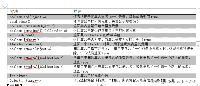 ? ? ? ? ?// 创建集合对象 ?? ??? ?Collection c1 = new ArrayList<>(); ?? ??? ?// 判断是否为空,即个数是否为0 ?? ??? ?System.out.println(c1.isEmpty()); ?? ??? ?// 集合中是不能保存基本类型的,需要转换为对应的包装类才可以 ?? ??? ?// 这里会进行自动装箱为Integer类型,然后发生多态转型为Object类型进行存储 ?? ??? ?c1.add(123); ?? ??? ?c1.add(new Integer(1)); ?? ??? ?c1.add(new Collection_01()); ?? ??? ?// 个数 ?? ??? ?System.out.println(c1.size()); ?? ??? ?System.out.println(c1.isEmpty()); ?? ??? ?// 删除,会调用要删除的元素的equals方法,但是Integer覆写了,所以可以把1删除掉 ?? ??? ?c1.remove(1); ?? ??? ?A a = new A("张三"); ?? ??? ?A a1 = new A("张三"); ?? ??? ?c1.add(a); ?? ??? ?// 所以使用集合保存自定义类型的时候,要注意是否要覆写equals方法,定义怎么算相等 ?? ??? ?c1.remove(a1); ?? ??? ?// 把集合转换为数组 ?? ??? ?Object[] arr = c1.toArray(); ?? ??? ?for (Object object : arr) { ?? ??? ??? ?System.out.println(object); ?? ??? ?} ?? ??? ?// 清空集合 ?? ??? ?c1.clear(); ?? ??? ?System.out.println(c1.size());