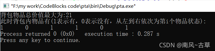 printf("此时背包内物品有(1表示有,0表示没有,从左到右依次为第i个物品状态):\n");