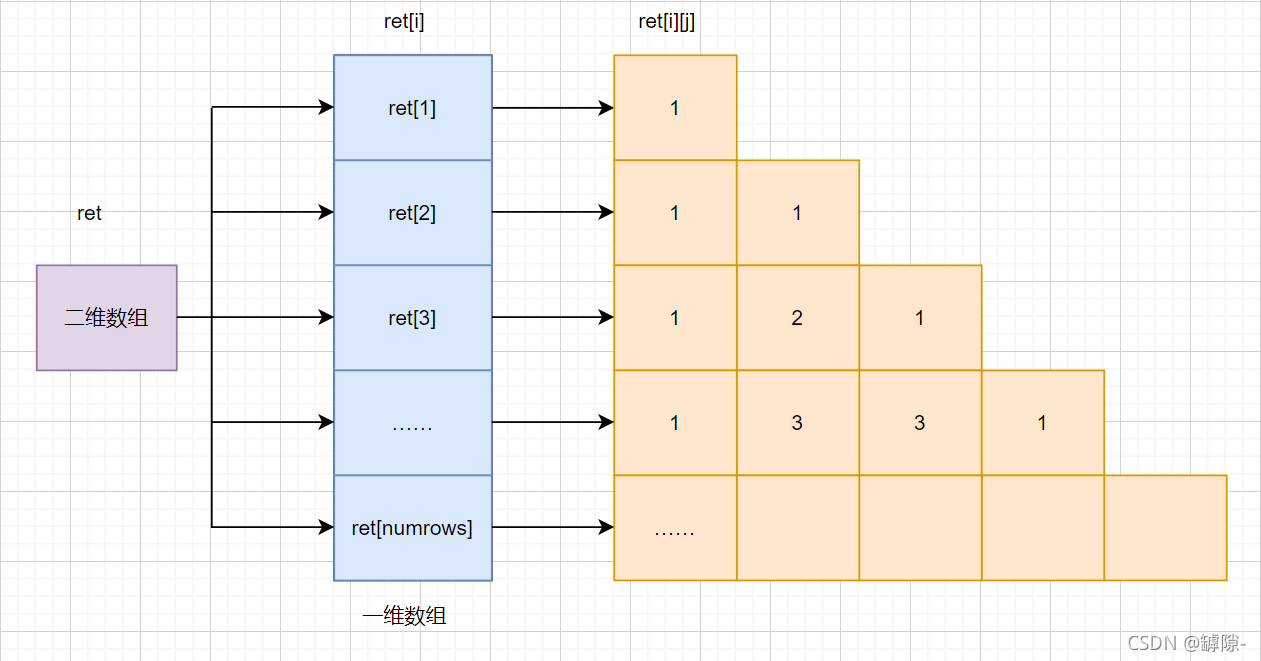 ①创建一个二维数组ret存储杨辉三角每一行每一列的数据
