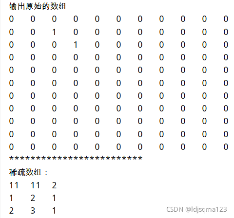 //转换为稀疏数组保存 //1.有效值的个数 int sum = 0; //有效值总数 for (int i = 0; i < 11; i++) { ? ? for (int j = 0; j < 11; j++) { ? ? ? ? if(array1[i][j]!=0){ ? ? ? ? ? ? sum++; ? ? ? ? } ? ? } } //2.创建一个稀疏数组 int[][] array2 = new int[sum+1][3]; array2[0][0] = 11; array2[0][1] = 11; array2[0][2] = sum;
