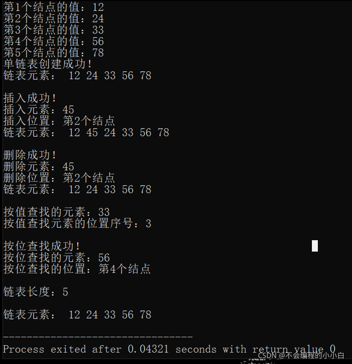 int main() { ?? ?DataType x,val; ?? ?int a[5] = {12, 24, 33, 56, 78}; ?? ? ?? ?LinkList * L = Creat_List(a,5); ?? ?printf("链表元素:"); ?? ?Traverse_List(L); ?? ? ?? ?if(Insert_List(L, 2, 45)) ?? ?{? ?? ??? ?printf("\n插入成功!\n"); ?? ??? ?printf("插入元素:45"); ?? ??? ?printf("\n插入位置:第2个结点\n");? ?? ?}?? ?? ?? ?else ?? ??? ?printf("\n插入失败!\n"); ?? ?printf("链表元素:"); ?? ?Traverse_List(L); ?? ? ?? ?if(Delete_List(L, 2, &val)) ?? ?{ ?? ??? ?printf("\n删除成功!\n"); ?? ??? ?printf("删除元素:%d\n",val); ?? ??? ?printf("删除位置:第2个结点\n"); ?? ?} ?? ?else ?? ??? ?printf("\n删除失败!\n"); ?? ?printf("链表元素:"); ?? ?Traverse_List(L); ?? ? ?? ?printf("\n按值查找的元素:33"); ?? ?printf("\n按值查找元素的位置序号:%d\n\n",Locate_List(L,33)); ?? ? ?? ?if(Get_List(L, 4, &x)) ?? ?{ ?? ??? ?printf("按位查找成功!\n");?? ? ?? ??? ?printf("按位查找的元素:%d\n",x); ?? ??? ?printf("按位查找的位置:第4个结点\n"); ?? ?} ?? ?else?? ? ?? ??? ?printf("查找失败!\n"); ?? ? ?? ?printf("\n链表长度:%d\n",Length_List(L)); ?? ?printf("\n链表元素:"); ?? ?Traverse_List(L); ?? ? ?? ?return 0; } LinkList * Creat_List(int a[], int n) { ?? ?int i; ?? ?LinkList * L = (LinkList*)malloc(sizeof(LinkList));//?? ?创建一个头结点,返回头结点的地址? ?? ?if(!L) ?? ?{ ?? ??? ?printf("申请空间失败!\n"); ?? ??? ?exit(-1); ?? ?} ?? ?LinkList * Tail = L;?? ?//?? ?创建一个尾指针,指向头结点? ?? ?Tail->next = NULL; ?? ?for(i = 0; i<n; ++i) ?? ?{ ?? ??? ?printf("第%d个结点的值:",i+1); ?? ??? ?printf("%d",a[i]); ?? ??? ?LinkList * p = (LinkList*)malloc(sizeof(LinkList)); ?? ??? ?p->data = a[i]; ?? ??? ?Tail->next = p; ?? ??? ?p->next = NULL; ?? ??? ?Tail = p; ?? ??? ?printf("\n"); ?? ?} ?? ?printf("单链表创建成功!\n"); ?? ?return L; } bool Empty_List(LinkList * L) { ?? ?if(L->next==NULL)?? ?//?? ?头结点指针域为空,为空表? ?? ??? ?return true; ?? ?else ?? ??? ?return false; } int Length_List(LinkList * L) { ?? ?int cnt = 0; ?? ?LinkList * p = L->next; ?? ?while(p!=NULL) ?? ?{ ?? ??? ?cnt++; ?? ??? ?p = p->next; ?? ?} ?? ?return cnt; } void Traverse_List(LinkList * L) { ?? ?LinkList * p = L->next; ?? ?while(p!=NULL) ?? ?{ ?? ??? ?printf("%3d",p->data); ?? ??? ?p = p->next; ?? ?} ?? ?printf("\n"); ?? ?return; }