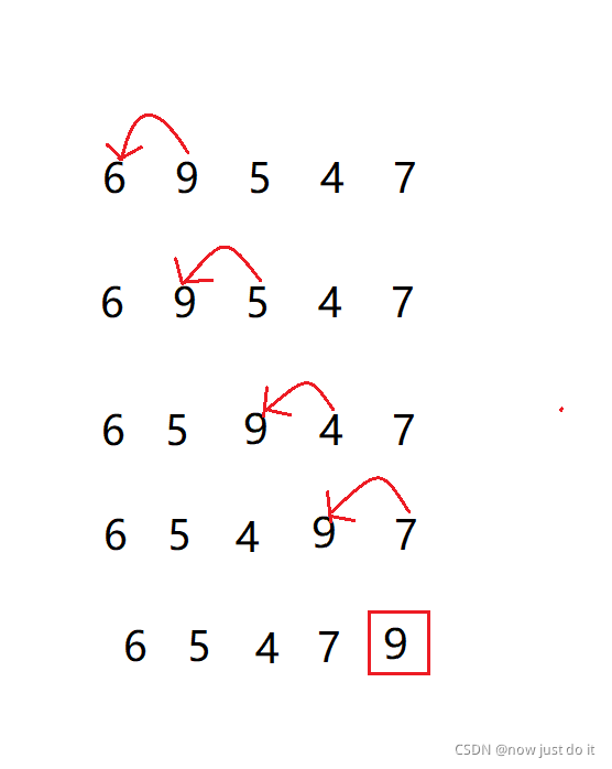 通过比较j和j+1的值来进行交换,将最大的值锁定在最后一个,进行循环。