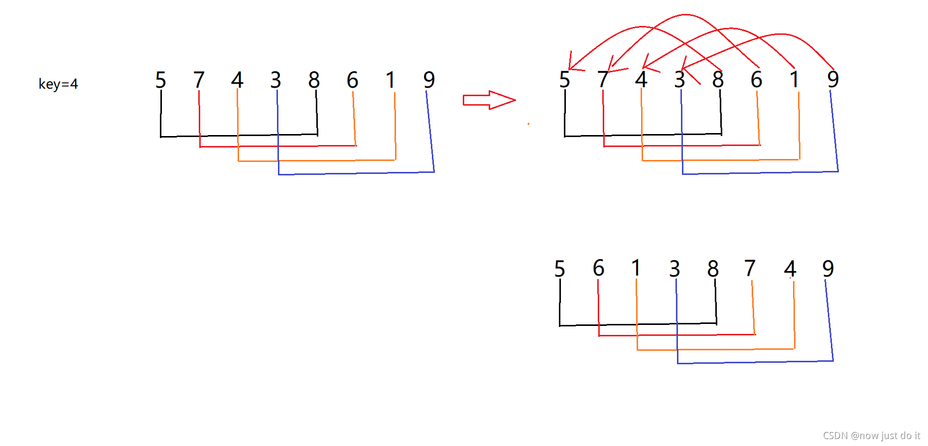 1.先选定一个小于length的整数key作为第一增量,然后将所有距离为key的元素分在同一组,并对每一组的元素进行直接插入排序。然后再取一个比第一增量小的整数作为第二增量(我们一般是除2),重复整个操作。 2.当增量的大小减到1时,就相当于整个序列被分到一组,进行一次直接插入排序,排序完成。