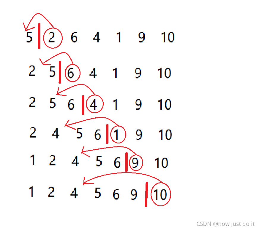 我们可以把第一个数字看成一个有序数列,从第二个开始循环遍历。在遍历的途中在定义一个循环,不断的与前面的有序数列进行比较,找到位置之后结束本次循环,并将数字插入到有序数列中去,从而达成目的。