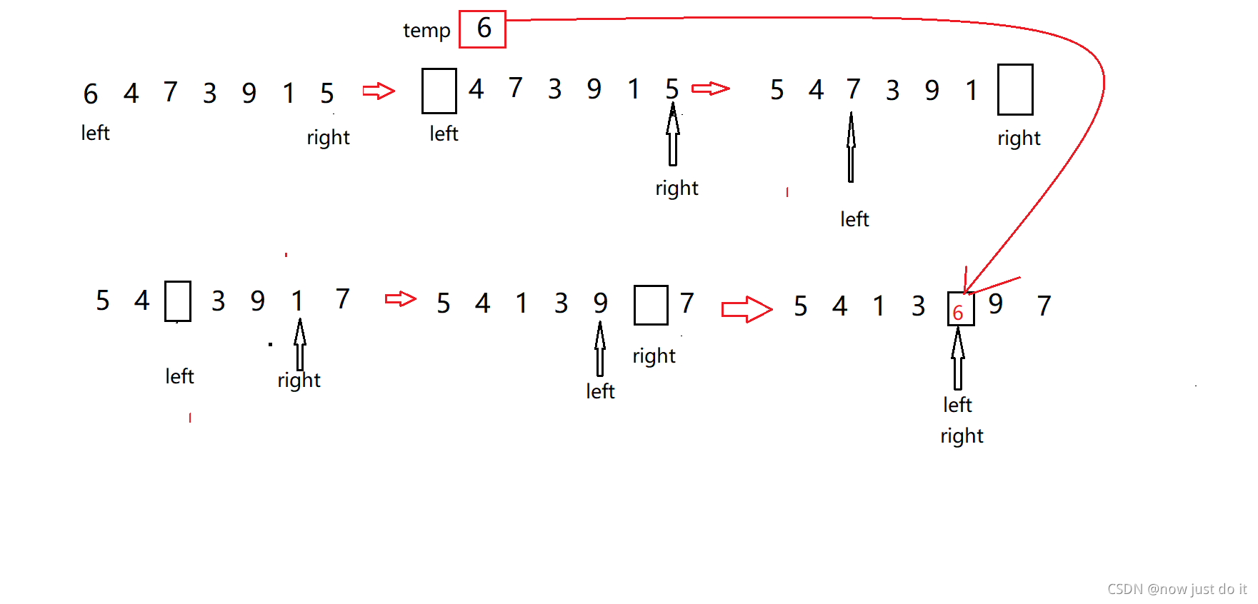 挖坑法就是将队首元素拿出来,从最后一个数向前遍历找到第一个小于队首元素的放入挖的坑中填补,在从前向后遍历找到第一个大于队首元素的放入又挖的坑中填平,重复上述过程。