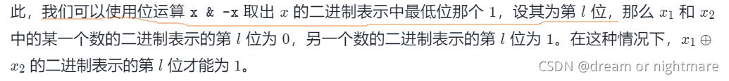 然后取 sumsum 二进制表示中为 1 的任意一位 k,sumsum 中的第 k?位为 1?意味着两答案的第 k?位二进制表示不同。