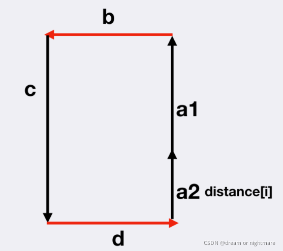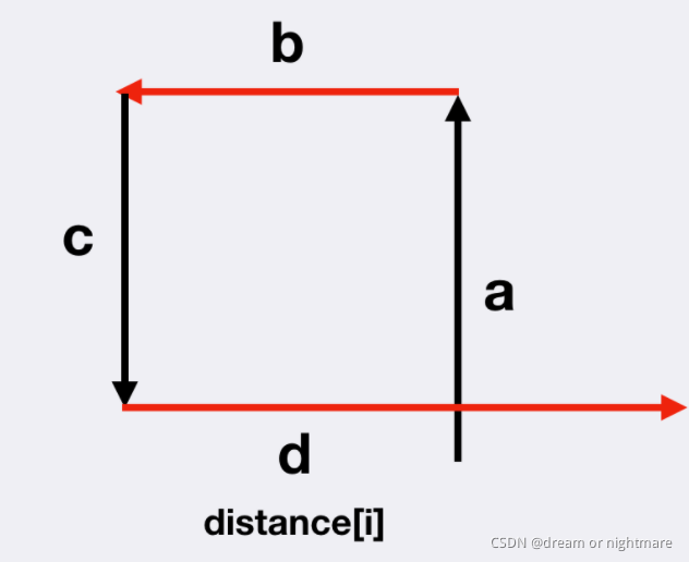 从 X-Y 平面上的点?(0,0)?开始,先向北移动 distance[0] 米,然后向西移动 distance[1] 米,向南移动 distance[2] 米,向东移动 distance[3] 米,持续移动。也就是说,每次移动后你的方位会发生逆时针变化。