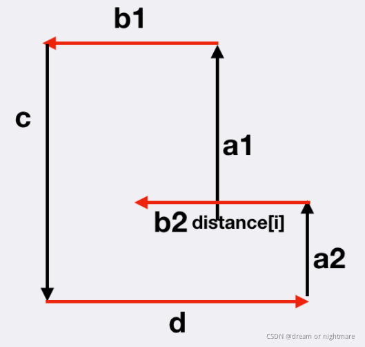 2.d[i] 与 d[i - 4]d[i?4] 发生相交:此时满足 d[i - 1] = d[i - 3]d[i?1]=d[i?3],同时 d[i] + d[i - 4] >= d[i - 2]d[i]+d[i?4]>=d[i?2];