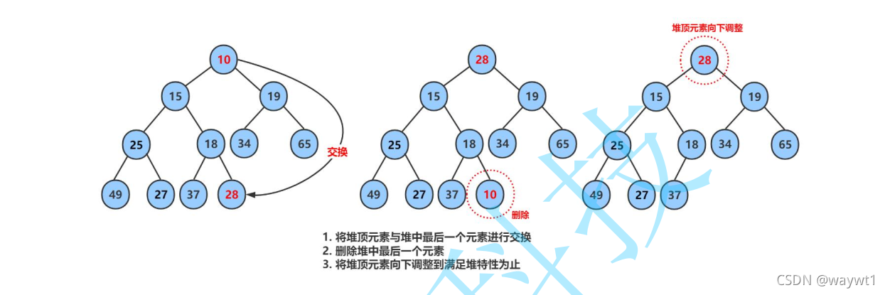 堆的删除是删除堆顶的元素,首先将堆顶的元素与最后一个元素交换,然后删除最后一个元素,再使用向下调整算法,将交换上来的元素调整至合适的位置,直到满足堆。