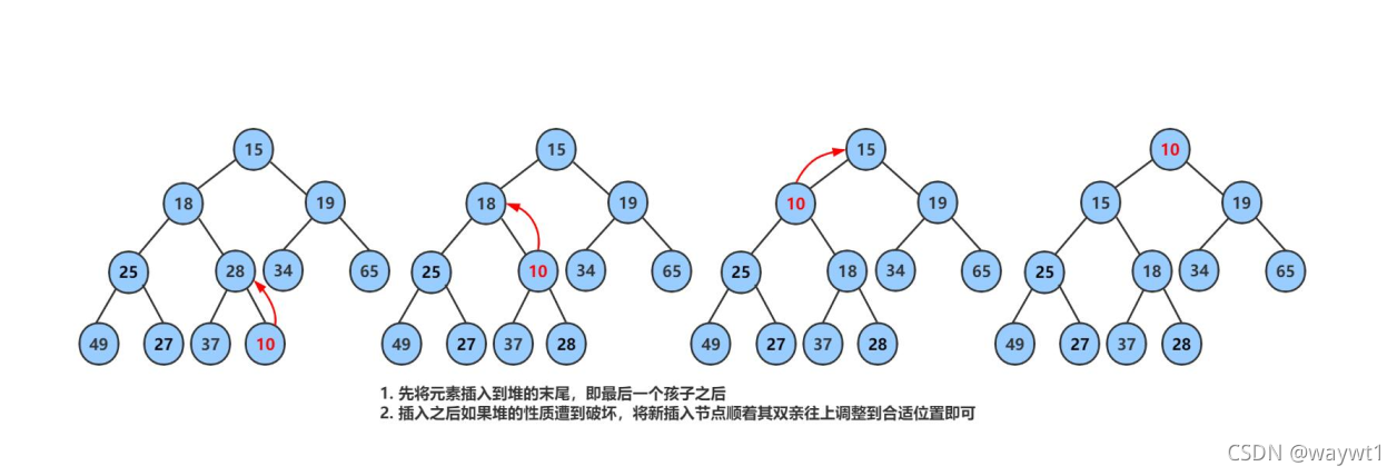 插入的元素不会影响从该元素到根上的其它元素,故只需要依次将插入的元素与其“父亲”相比即可。若小于则交换,然后向上迭代,否则该元素已经到达满足小堆的合适位置。