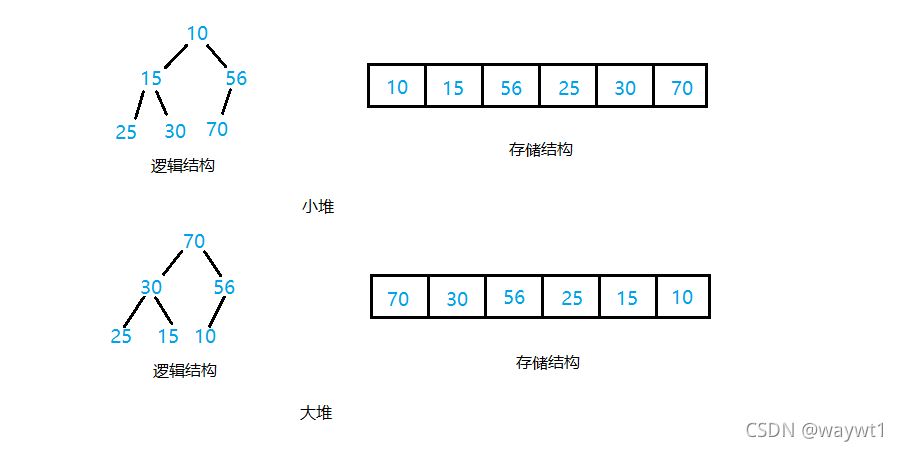 由于我们是把一个集合中的元素按二叉树的顺序存储方式,存储在一个一维数组中,故堆的存储结构是一个一维数组,但我们是以二叉树的顺序存储方式方式进行存储,所以我们可以把这个一维数组想象成一颗二叉树,故堆的逻辑结构是一颗二叉树。