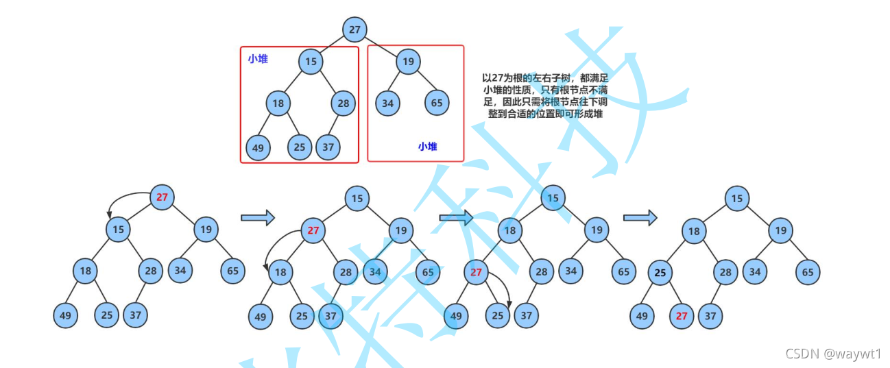 由于是建小堆,将该元素与它最小的一个“孩子”相比,若”孩子“更小,则将其交换,然后向下迭代,否则该元素已经到达满足小堆的合适位置。