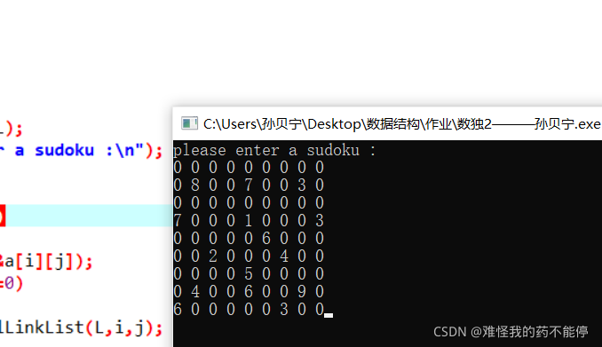 ???????? ?利用while进入循环(注:因为循环条件是p->next!=NULL,如果循环条件是p!=NULL的话,当指针p指向链表的最后一个元素的话,进入这条语句 ,最后一个空位肯定合适,所以指针p还会往后移一个,所以就找不到p的位置了,也就无法回溯(p=p->before);所以解决办法就是p->next!=NULL,并且存链表的时候在末端多存一个垃圾值);循环里面入栈,然后进行do while先从0++一次,然后通过qualified函数判断空位能不能填这个数字,能的话返回0跳出循环,不能继续do while。然后通过if判断,是通过怎样的方式跳出循环的:if跳出循环后a[row1][list1]<10就证明,这个数字可以填在此时的空位,则指针往后移动,下一个入栈,else则说明1-9没有合适的数字填到这个空位,则给这个空位初始化为0,出栈,将指针回调,继续循环。