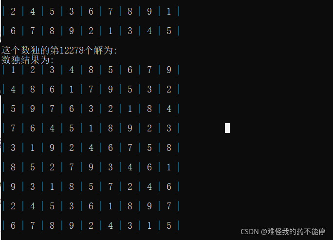 ? ? ? ? ?将数组元素全部初始化为0,然后将空位的行列入栈,然后开始给栈顶元素的空位逐步++;每次++都要判断这个数填在这个空位合不合适,合适的话入栈下一个元素,否则就出栈,这样就回溯到了上一个空位,继续++,这样当最后一个空位解决后,就出现了数独的第一个解,然后解决多解的话,将此时的栈顶元素出栈,给栈顶元素++,将指针指向上一个空位,利用goto语句来实现数独的多解;