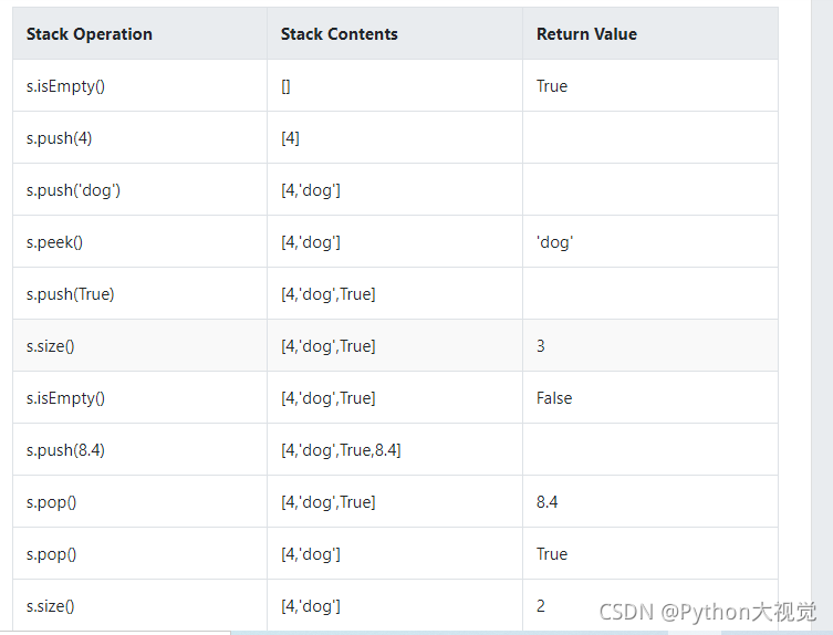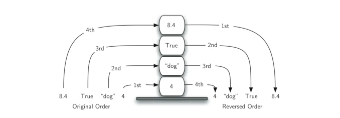 在python中,进栈顺序和出栈顺序恰好相反,如下图所示,入栈的顺序为:4,dog,True,8.4,则出栈的顺序依次为:8.4,True,dog,4,