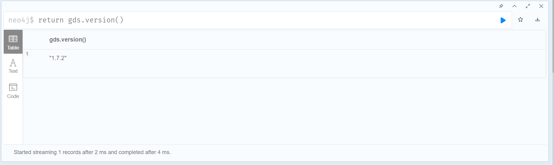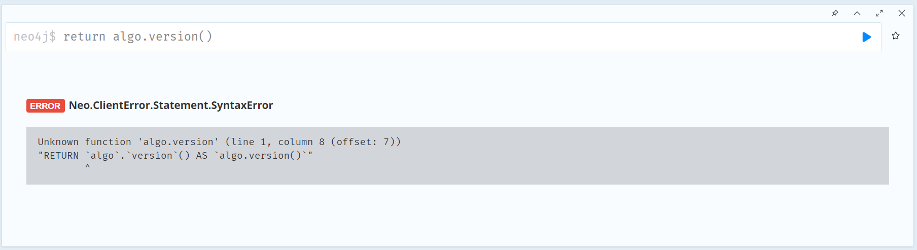 以为是jar版本的原因(所以才有开头版本适配那一段的说明) 3.发现是验证语句的问题,步骤2参考文章中下载的是Neo4j Graph Algorithms 3.5.14.0,所以验证使用的语句是RETURN algo.version()。而我下载的是Neo4j-community-4.3.7,下载的图算法的jar包是GDS1.7.2版本,所以验证语句应该为RETURN gds.version() 参考链接:Neo4j:入门基础(七)之Algo插件_Puzzle的博客-CSDN博客 ? ?安装好啦! 附官方的完整下载GDS的教程链接:Neo4j Server - Neo4j Graph Data Science |