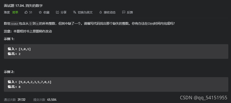 对于本题,可先对0-n的连续数字异或一遍,接着对含有欠缺数字的数组中的每个数字异或,那么该数组中未欠缺的数字和0-n连续数字会异或2次,结果为0;而因为缺少1位数字,原先0-n的连续数字中必有1位只参与了异或1次,即为本身,得解。