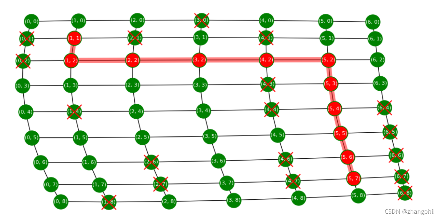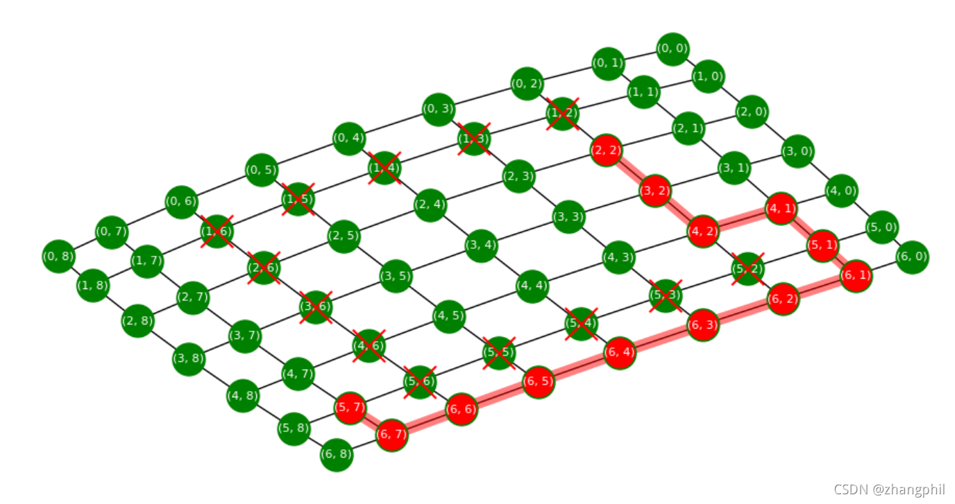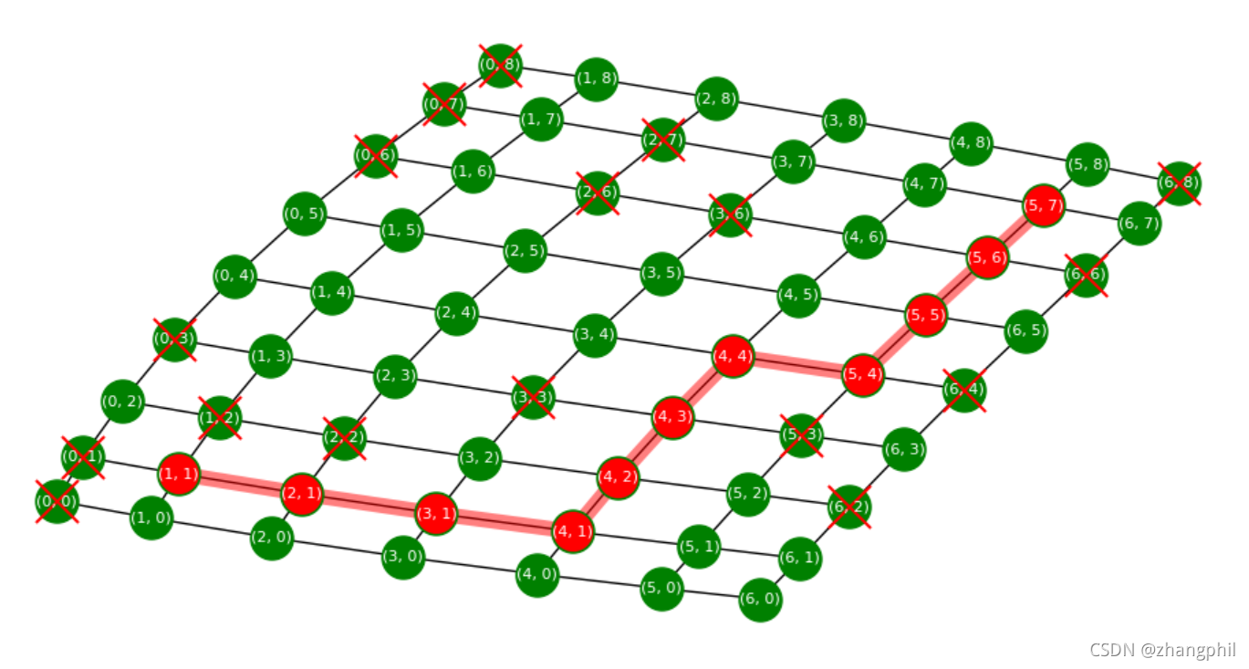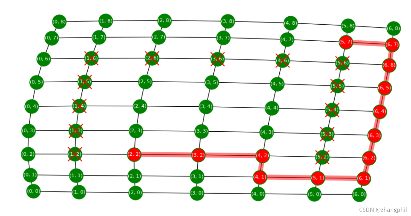 (3)网格中的节点最终被标记为红色且被淡红色粗线描出来的就是选的路。