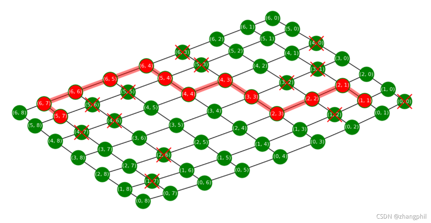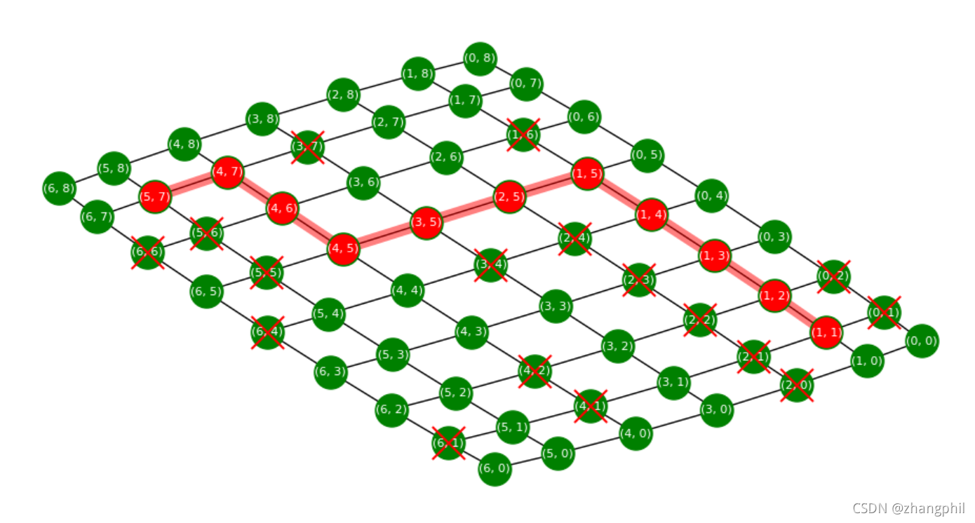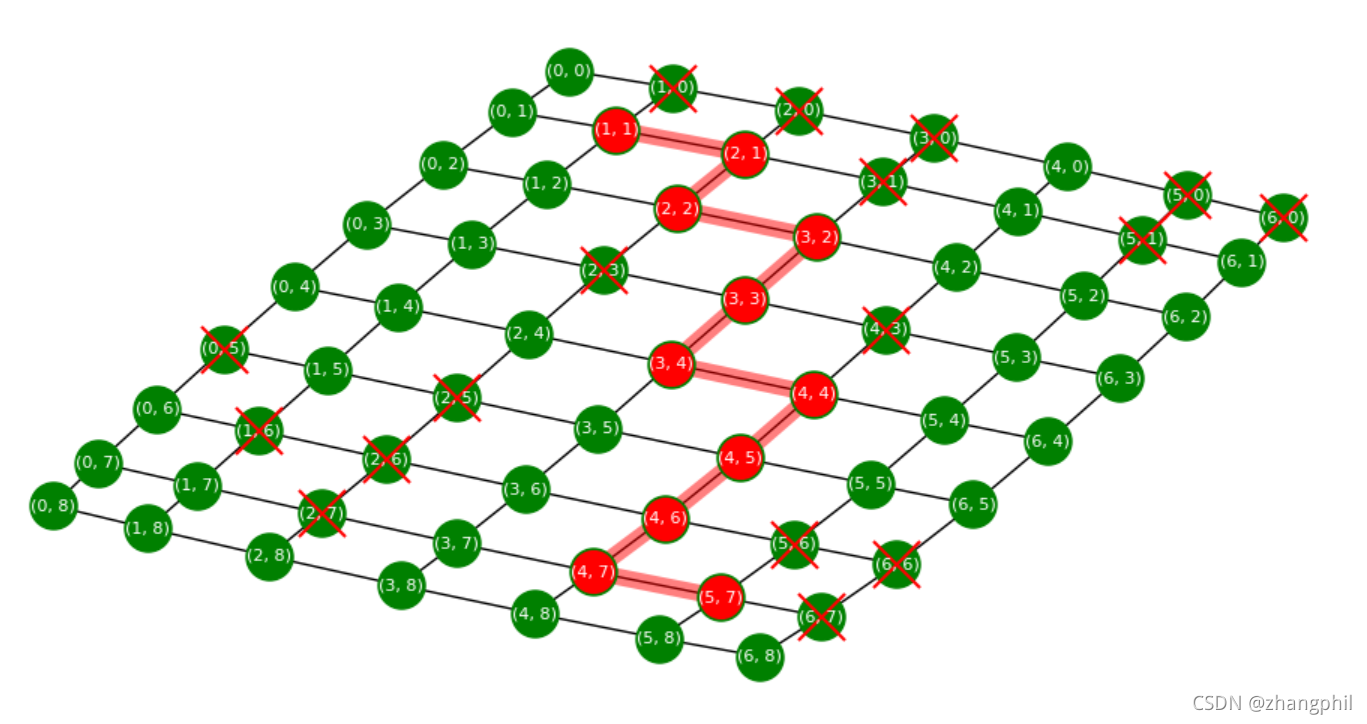 (3)网格中的节点最终被标记为红色且被淡红色粗线描出来的就是选的路。