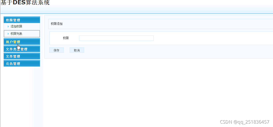 程序文本相似比较系统要满足以下几个方面的功能需求: (1)管理员权限具有以下功能: 1.权限管理:对权限信息进行添加、删除、修改和查看 2.用户管理:对用户信息进行添加、删除、修改和查看 3.公告管理:对公告信息进行添加、删除、修改和查看 4.文件管理:对文件信息进行添加、删除、修改和查看。 (2)普通用户权限具有以下功能: 1.公告查看 2.用户注册、登陆 3.查看已经检测的文件,上传txt文件可以进行对文件进行加密,和解密操作 系统对上传的txt文件进行IO流读取,然后进行对应加密或者解密然后把处理后的字符串IO流的方式进行回写到txt方便用户下载
