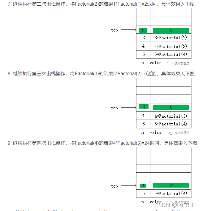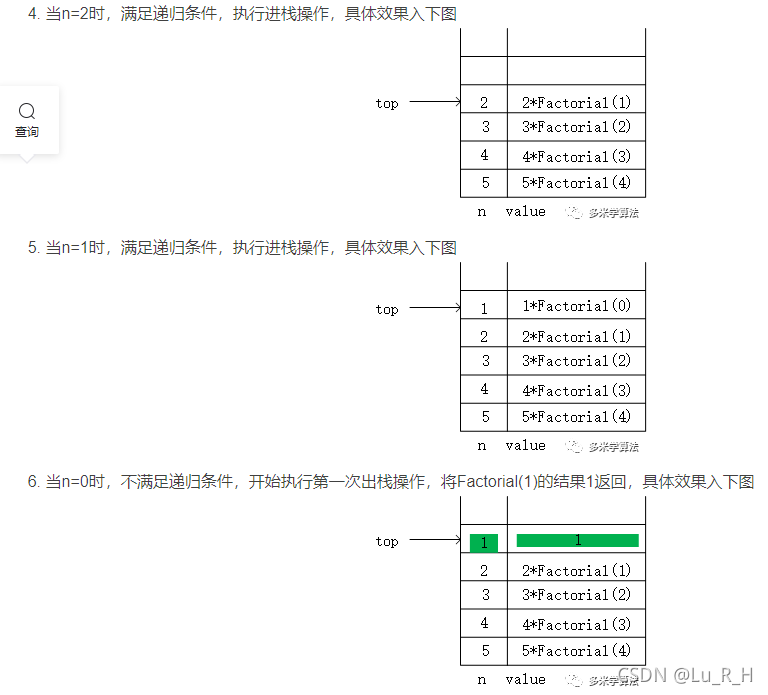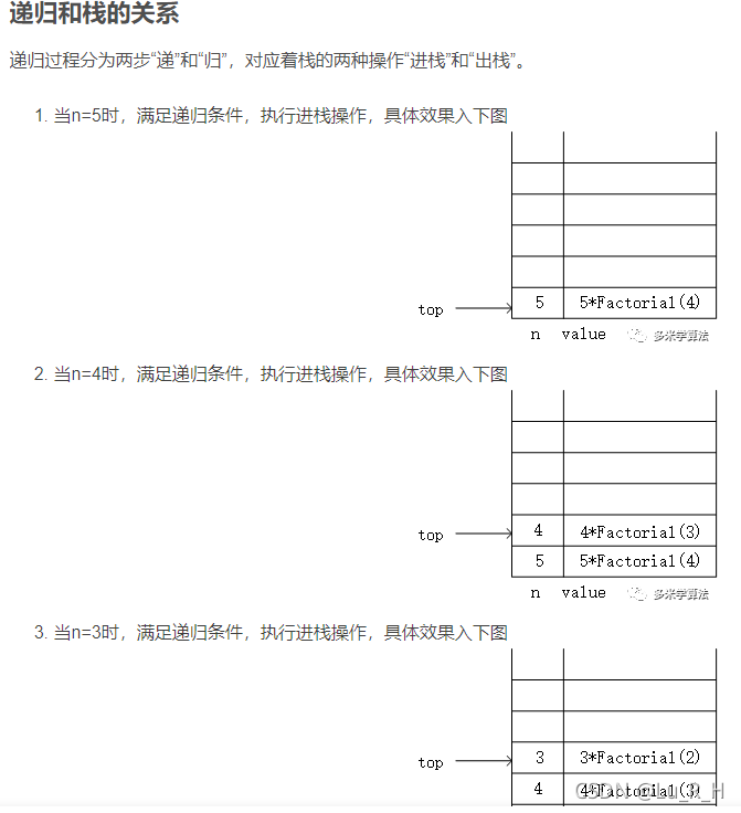 这使我想起来面试时学长说过的栈结构,便设想递归是不是就是用栈结构实现的,最终经过搜索得到肯定的结论。但对于栈结构,现在只是初步认识到。对于递归,也没有完全掌握,以后还得通过大量练习才能掌握。对于栈结构与递归的关系,在CSDN上有制作者给出了解释,在此引用:
