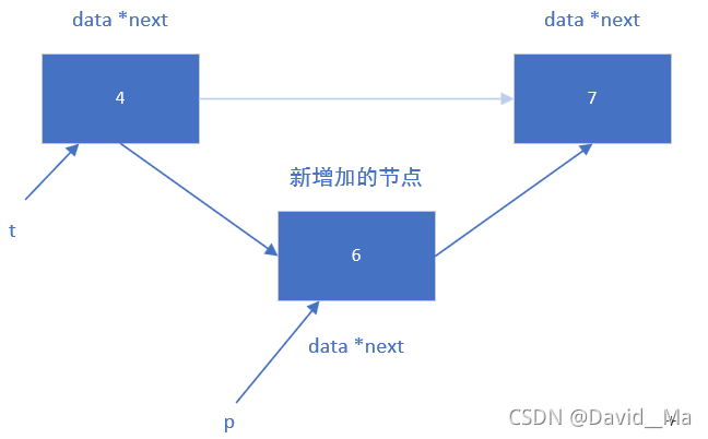 p->next=t->next;//新增节点的后继指针指向当前节点的后继指针所指向的节点