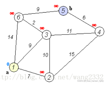 a.初始时,只包括源点,即S = {v},v的距离为0。U包含除v以外的其他顶点,即:U ={其余顶点},若v与U中顶点u有边,则(u,v)为正常权值,若u不是v的出边邻接点,则(u,v)权值 ∞; b..从U中选取一个距离v最小的顶点k,把k,加入S中(该选定的距离就是v到k的最短路径长度)。