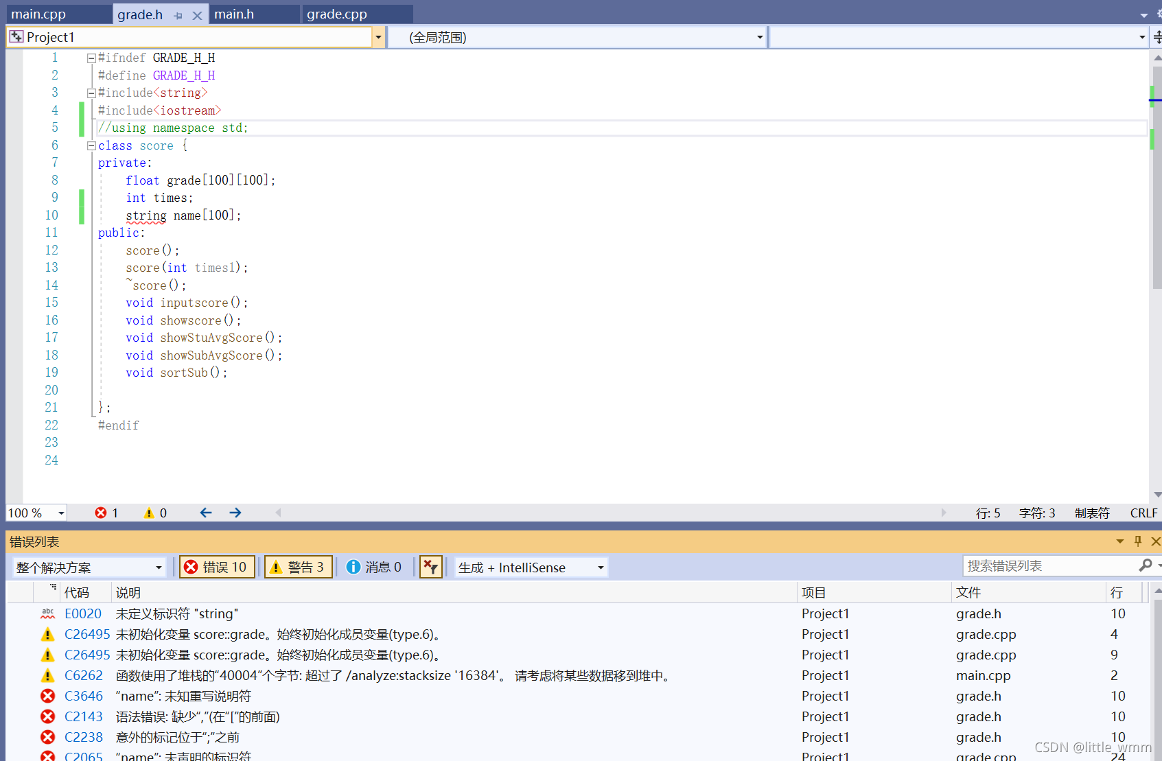 2.在grade.h文件中,进行string name[100]声明,debug会出现以下错误:string未定义;