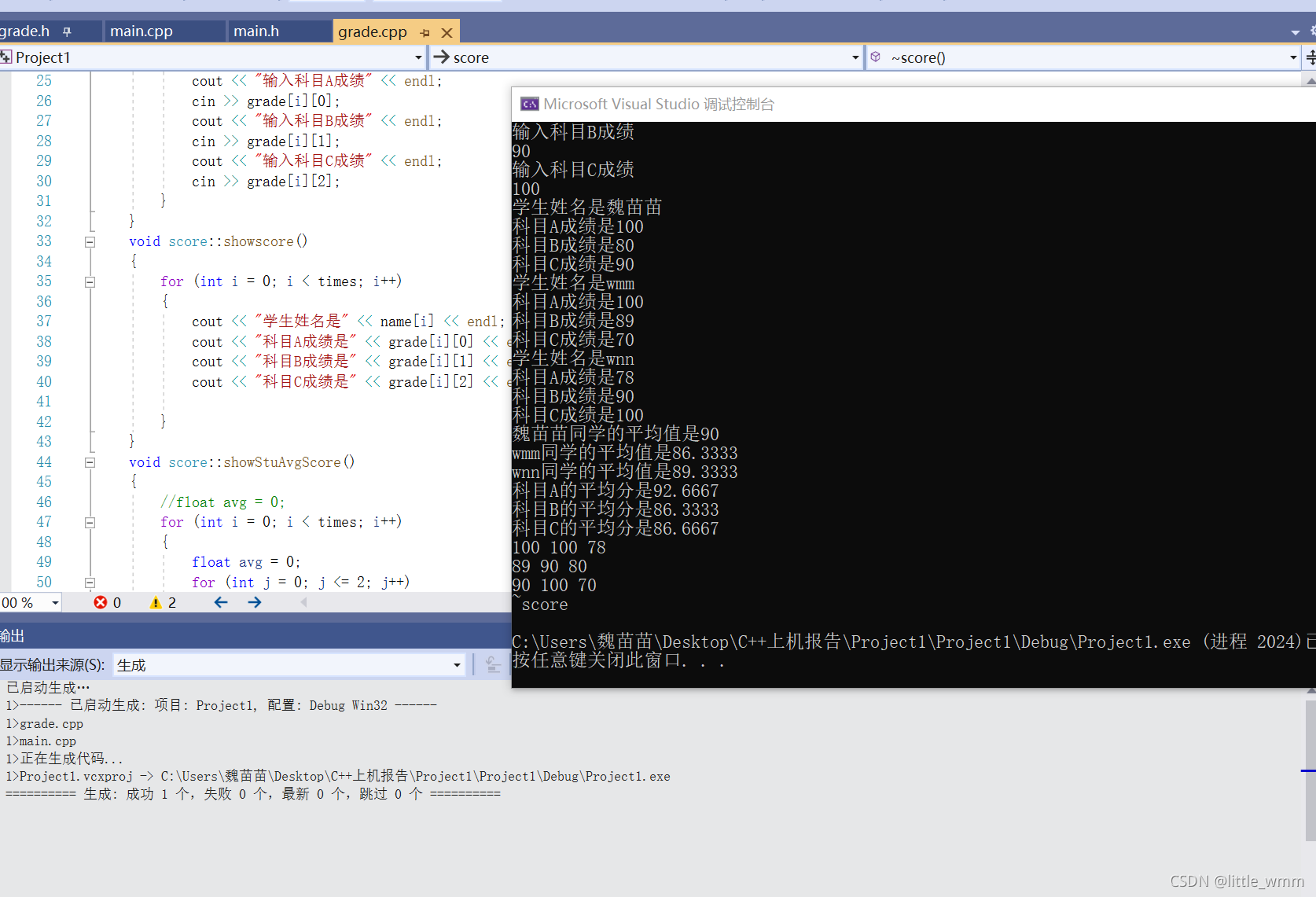 ? ? ? ? 1.在debug中,在grade.h文件中进行类的声明后,我在grade.cpp中进行类的定义,编译后出现错误:score class重复定义。经过搜索之后,执行grade.cpp源文件中的代码,#include"grade.h"此句代码,编译器回去查找grade.h头文件,发现score这个类已经定义,继续执行,在下面我又进行了score的定义,导致debug报错。于是在grade.cpp中,删除了class score,直接进行函数的定义,调整之后程序正常运行,代码如下:
