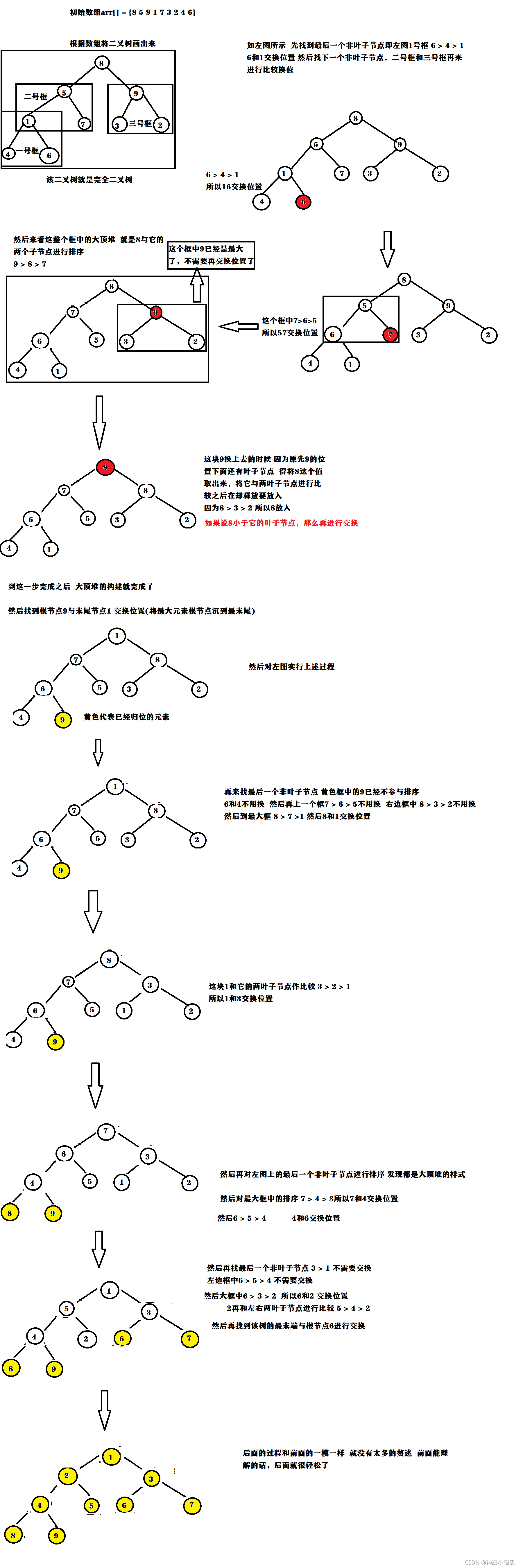 AdjustHeap(arr, 0, (len - 1 - i) - 1); //这块的(len-1-i) - 1的意思就是将排序完的数就不再参与排序 上述原理图上面有说到的