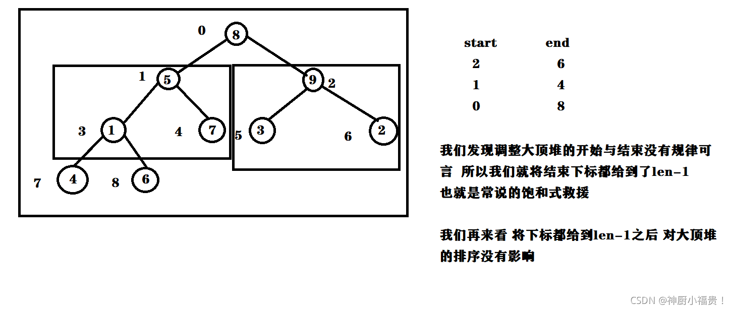 下面这个原理图来展现一下为什么在调整大顶堆的时候 要将下标给到len-1最大值