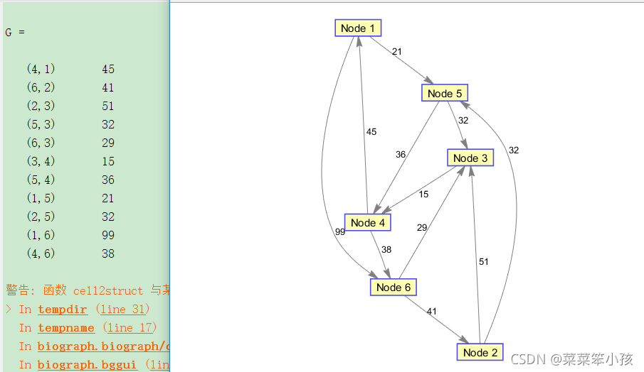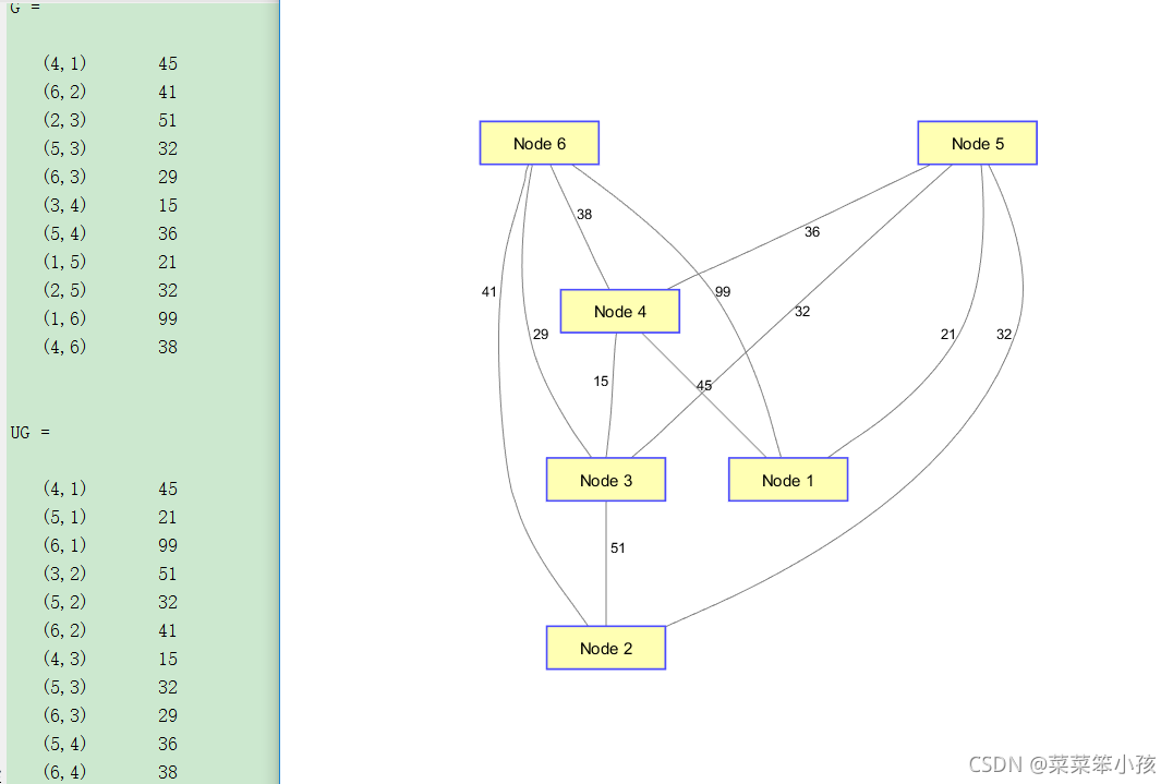 G = sparse([6 1 2 2 3 4 4 5 5 6 1],[2 6 3 5 4 1 6 3 4 3 5],[41 99 51 32 15 45 38 32 36 29 21])