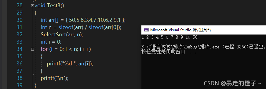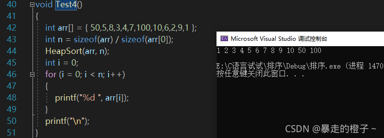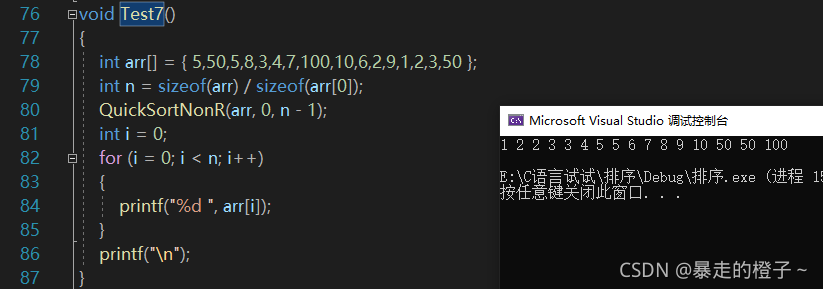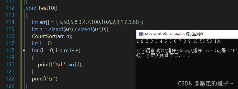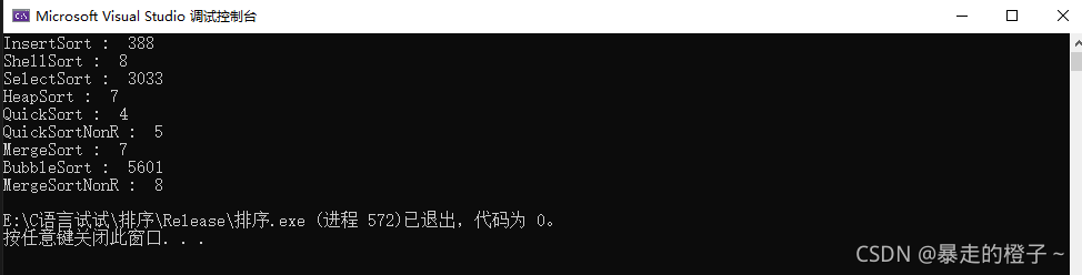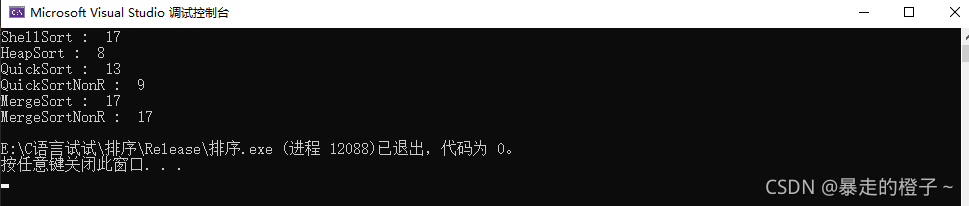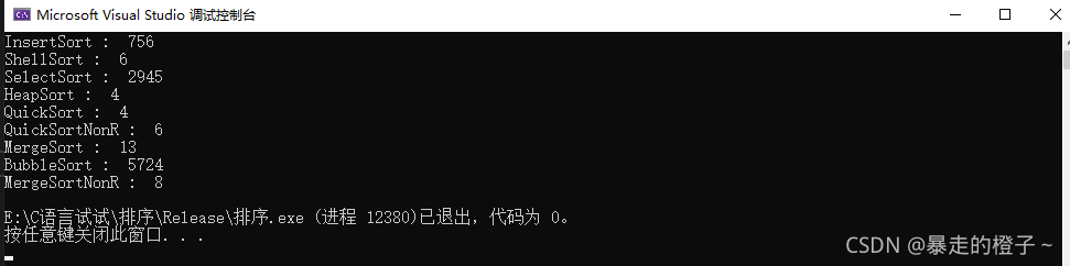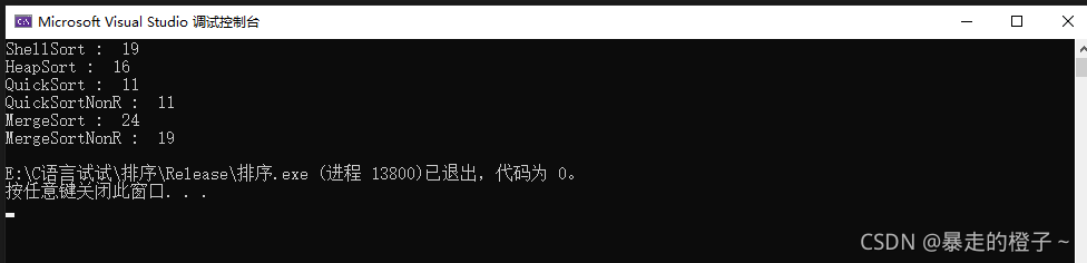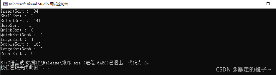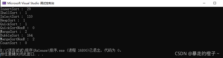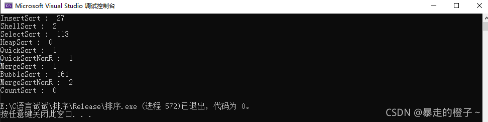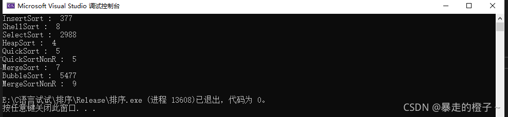 ?由于计数排序在这种情况开辟的空间过大,我的电脑栈空间不够用,在这里屏蔽掉计数排序的测试了。