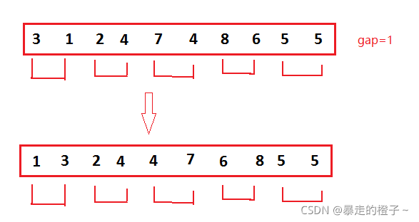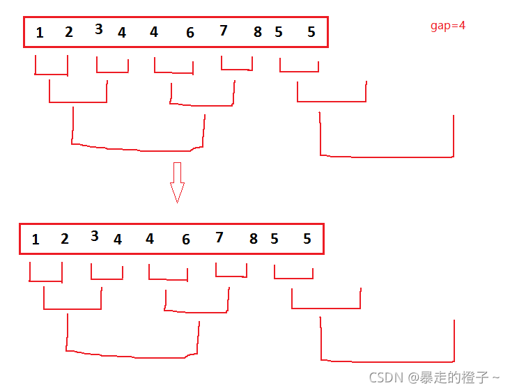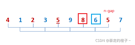 注意:希尔排序是针对插入排序的优化。思想是,先进行预排序,是序列不断接近有序,当gap等于1时,相当于插入排序,对于接近有序的序列插入排序效率很高。