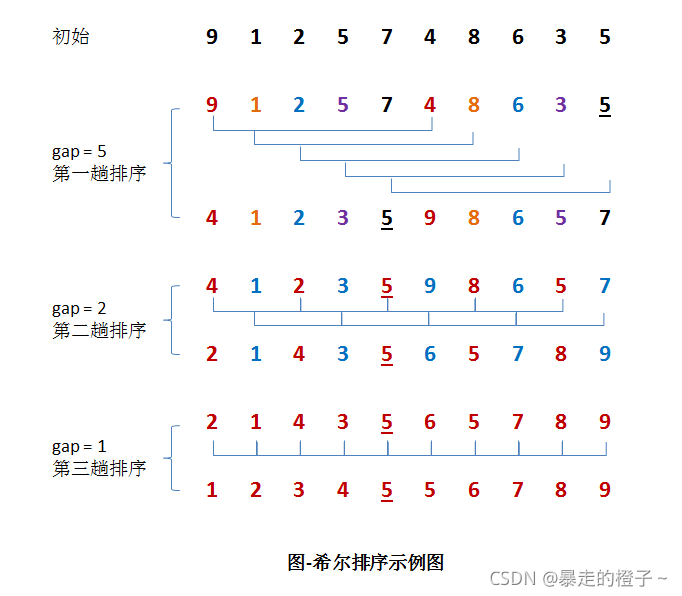 希尔排序( 缩小增量排序 ) 希尔排序法又称缩小增量法。希尔排序法的基本思想是:先选定一个整数,把待排序文件中所有记录分成个组,所有距离为的记录分在同一组内,并对每一组内的记录进行排序。然后,取,重复上述分组和排序的工作。当到达gap=1时,所有记录在统一组内排好序。