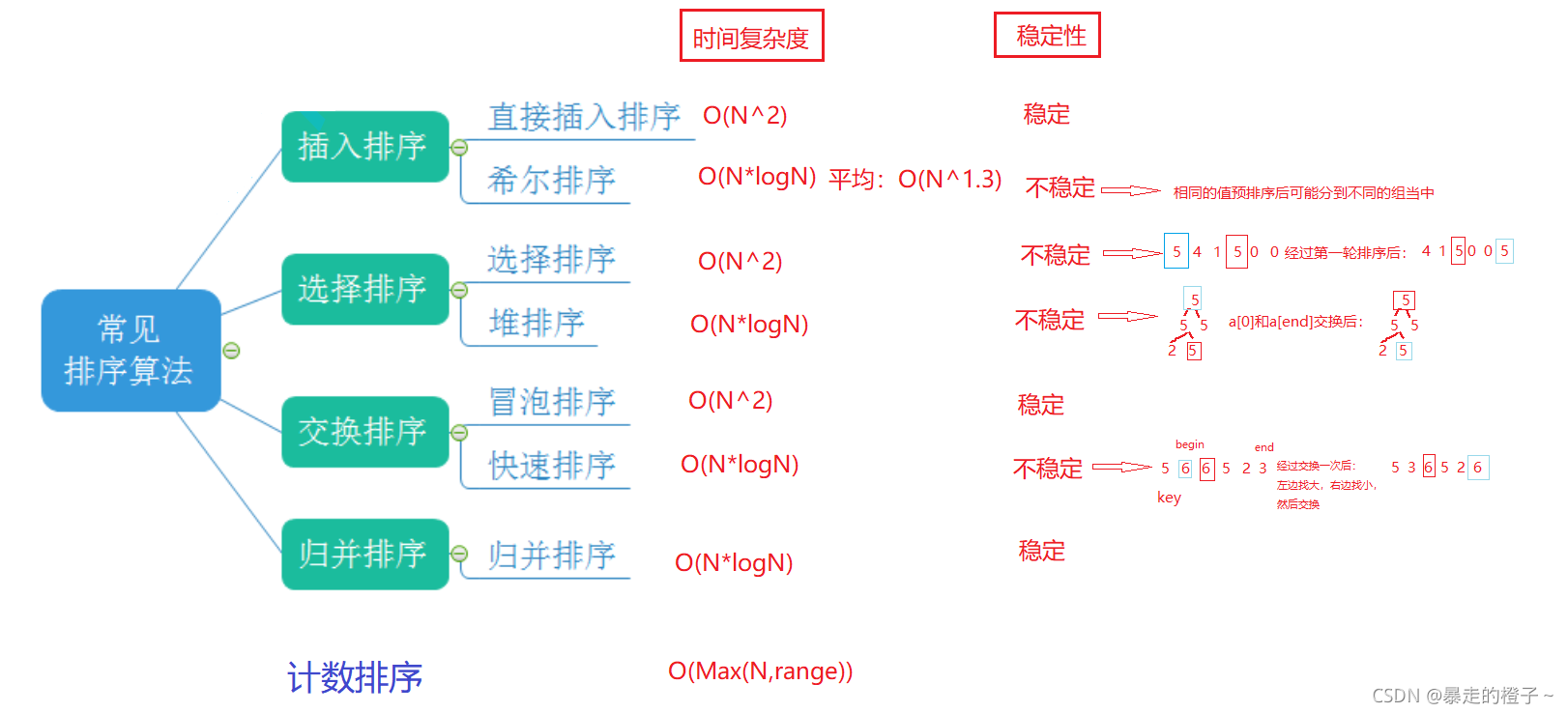 稳定性:数组相同的值,在排序以后相对位置是否变化。可能会变,不稳定。能保证不变的,就是稳定。