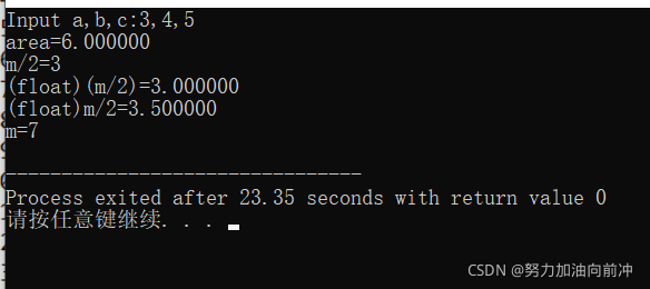 area=(float)sqrt(s*(s-a)*(s-b)*(s-c));// float用括号括起来