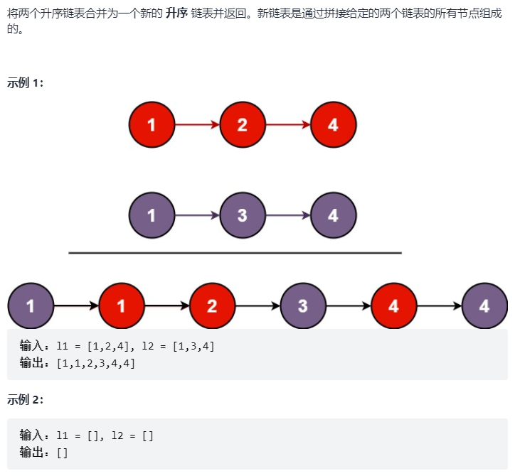 将两个有序链表合并为一个新的有序链表并返回。新链表是通过拼接给定的两个链表的所有节点组成的。【OJ链接——合并两个有序链表】