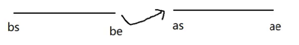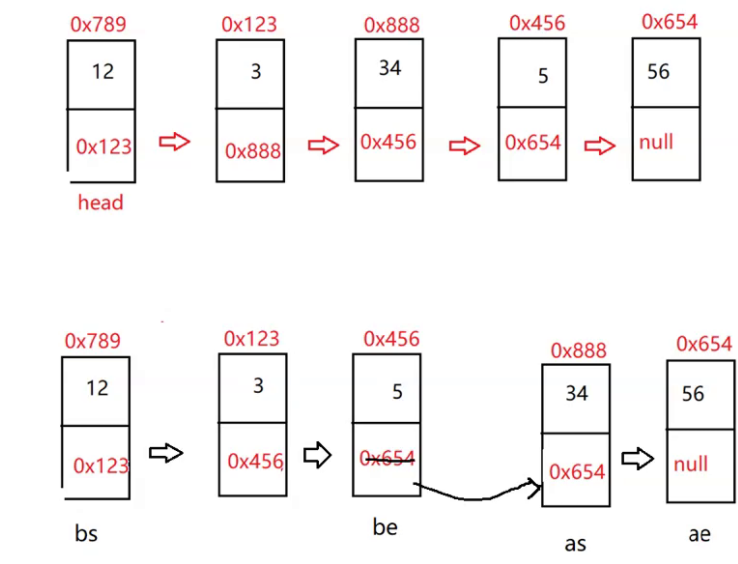 ?思路:我们可以将这个链表分割为两个链表,小于所给节点值x的放在前面的链表,大于节点值x的放在后面的链表,最后再将两个链表拼接起来。如下图所示:bs为前面链表的起始节点,be为尾节点;as为后面链表的起始节点,ae为后面链表的尾节点。