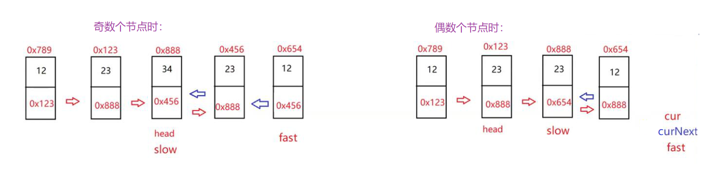 当我们逆置结束后,最后如何判断是否为回文序列呢?这就要分两种情况了——当链表的节点数量为奇数时,让slow与head(头结点)同时走,在他们相遇时,值一直相等则为true,否则为false;当链表的节点数量为偶数时,让slow与head同时走,不仅要在每一步的时候判断他们的值是否相等,还要判断 head.next是否等于slow (因为偶数节点不用走到相遇,最后的相遇即为相邻)