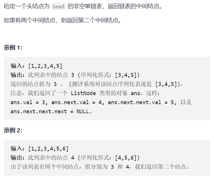 给定一个带有头结点 head 的非空单链表,返回链表的中间结点。如果有两个中间结点,则返回第二个中间结点。??
