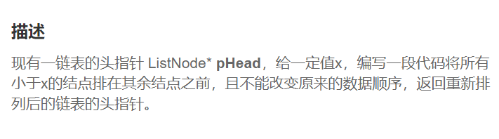 编写代码,以给定值x为基准将链表分割成两部分,所有小于x的结点排在大于或等于x的结点之前。?【OJ链接——链表分割】