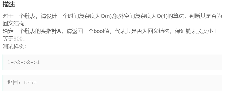 对于一个链表,请设计一个时间复杂度为O(n),额外空间复杂度为O(1)的算法,判断其是否为回文结构。【OJ链接——链表的回文结构】