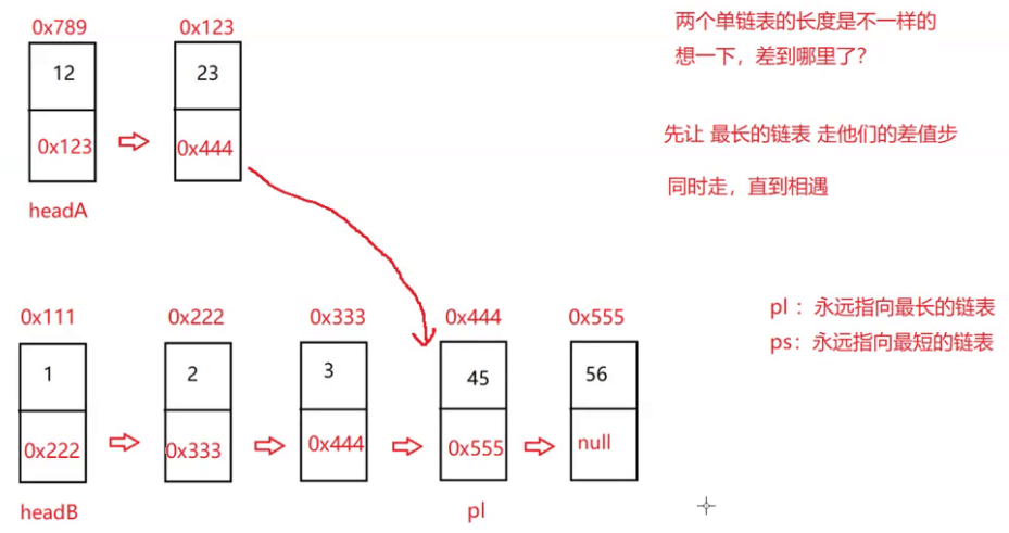 具体实现的时候可以先定义两个引用 pl 与 ps,pl 指向两个链表中更长的头结点,ps 指向长度更短的链表的头结点。(那你最开始不知道哪个长怎么办?其实可以任意指定一个,因为你最后还是要进行判断修正的)然后再遍历获取两个链表的长度,用你默认的更长的长度减短的长度。如果最后得出的长度小于0就说明你默认的是相反的,再进行调换,把长度修正即可。最后让更长的那个pl先走差值步,再进入循环同步走,当他们相遇时,退出循环,返回pl/ps即可。?