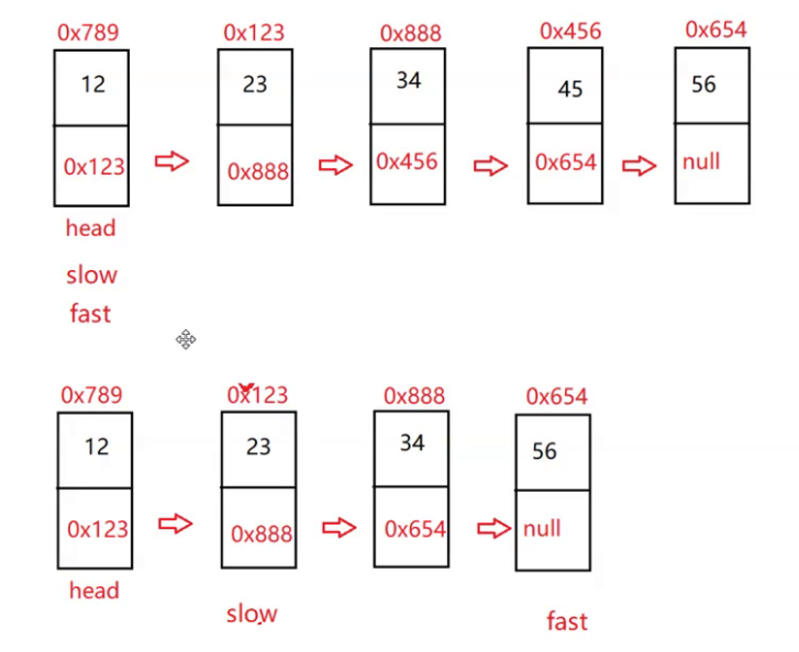 大致的过程知道后,我们具体该如何实现呢?首先,找到链表的中间节点,这个方法我们在之前的题已经说过了,现在再复习一下——用 slow 指针与 fast 指针,slow一步 fast两步同时走,fast或fast.next为空时,slow所在节点即为中间节点。