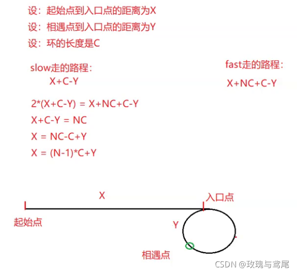 2、让slow指向起始点位置,fast指向相遇点的位置(此时当然也可调换位置,因为现在开始它们走的速度是相同的),然后一步一步走,每走完一步判断他们是否相遇,如果相遇,则返回该节点(由上述推导可得最后相遇点的地方就是入环节点)