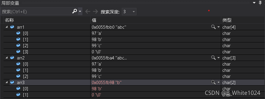 debug一下:  可以看到: 当用"abc"方式定义时,结尾处默认添加了 ‘\0’ ,因此可以正常打印出结果。 当用{ ‘a’,‘b’,‘c’ }方式定义时,由于没有加上 ‘\0’ ,因此用%s打印字符串时找不到结束标志,所以会一直在内存中继续找下去,直到找到 ‘\0 ‘才结束打印,这个过程完全不可预测的,随机的。 当用{ ‘b’ ,’\0’}方式定义时,手动添加了结束标志 ‘\0’ ,因此可以正常打印结果。 此外,可以发现结束标志 ‘\0’ 是不算做字符串长度的,但是算作数组的长度。