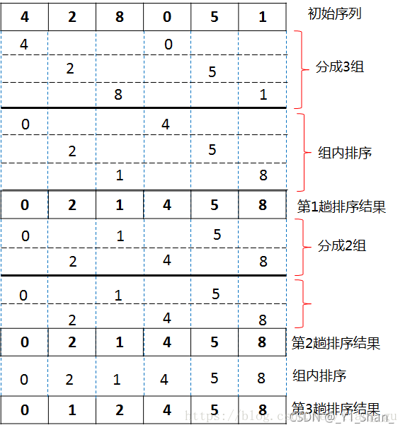 是对于直接插入排序的一种优化。先将待排记录序列分割成为若干子序列分别进行插入排序,待整个序列中的记录"基本有序"时,再对全体记录进行一次直接插入排序。适用于较为庞大的数据排序
