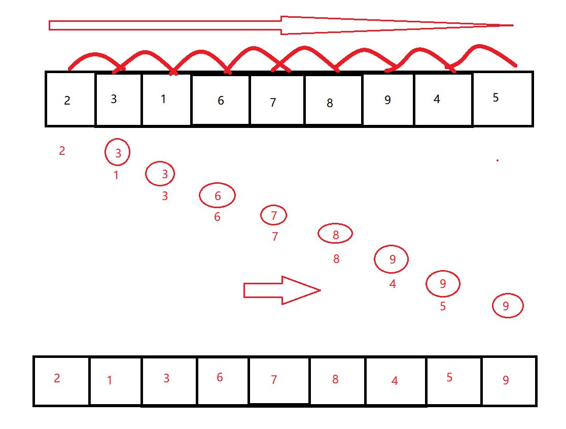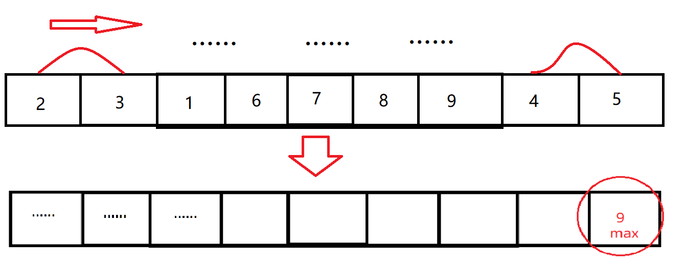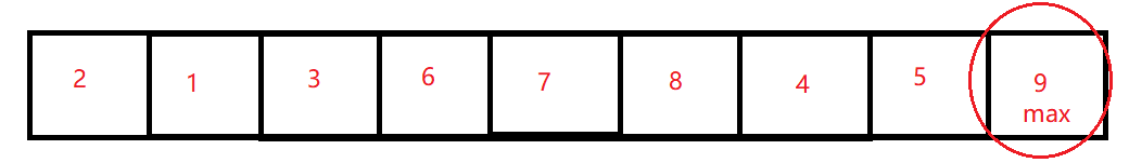 ?九轮之后,我们将九个元素全部置成我们脑海中逻辑数组(也就是每次减少一个遍历长度的所抽象出来的数组)的最大位上,即得到了一个有序数组{ 1 ,2 ,3 ,4 ,5 ,6 ,7 ,8 ,9? }