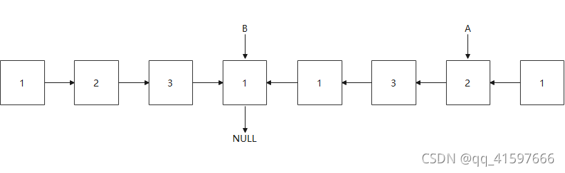 思路2:申明两个快慢指针(A和B)指向头节点,然后A指针一次走两步,B指针一次走一步,当A指针的Next.Next(下一步的下一步,此处应判断下一步是否为NULL)为NULL时,B指针刚好到中点,然后将B指针以后的元素压入栈中,再一次进行遍历链表,使遍历到的链表元素与栈中弹出的元素进行比较,如果链表中的元素与栈中弹出的元素相等则是回文结构。空间复杂度O(N/2)